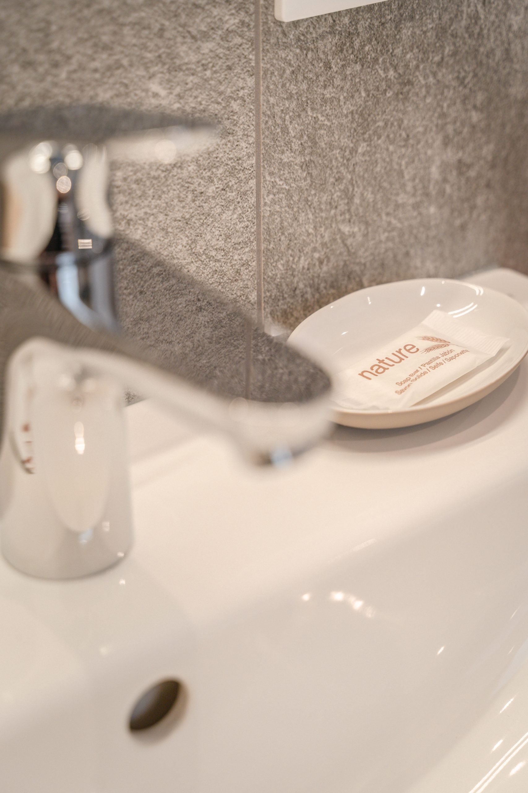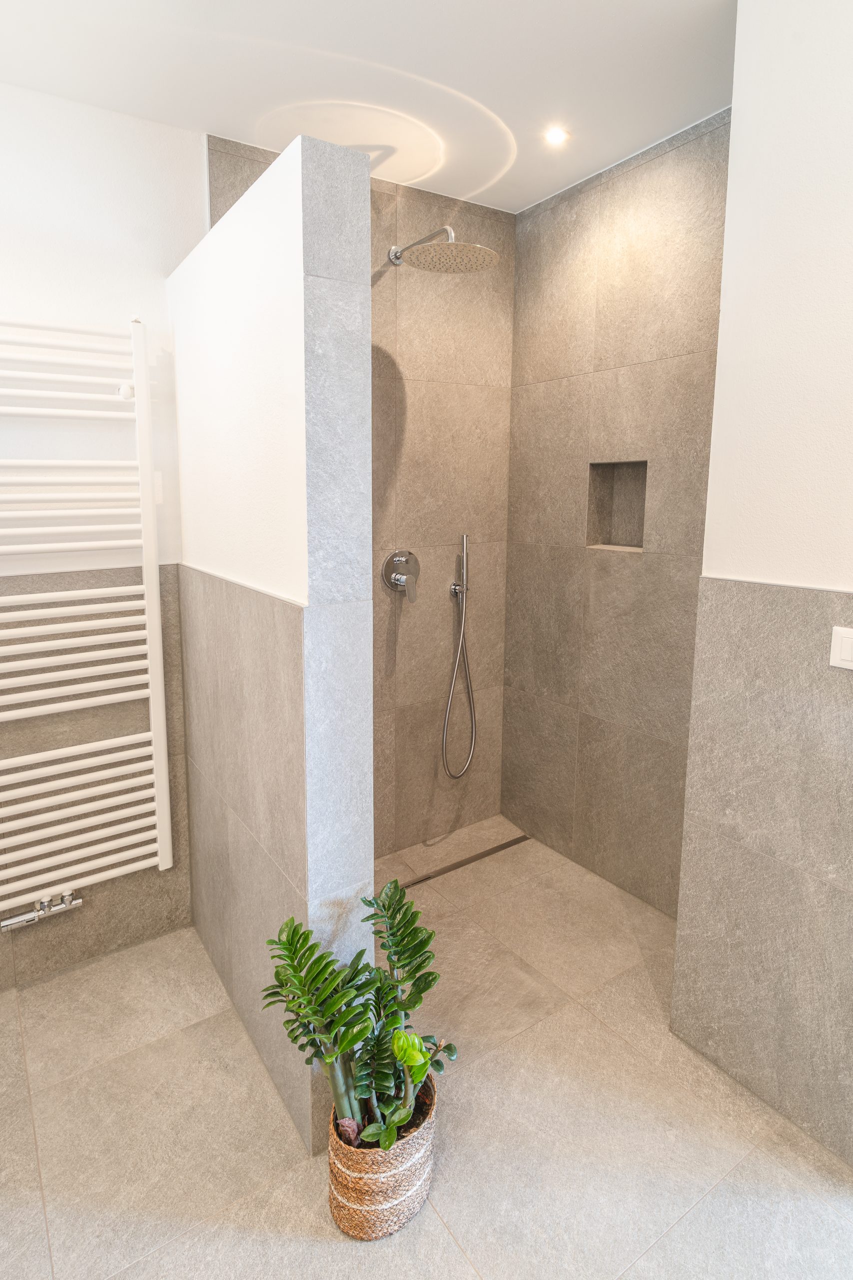 • 1 geräumiges Bad mit ebenerdiger Regendusche, Waschbecken, Föhn, WC & Bidet
