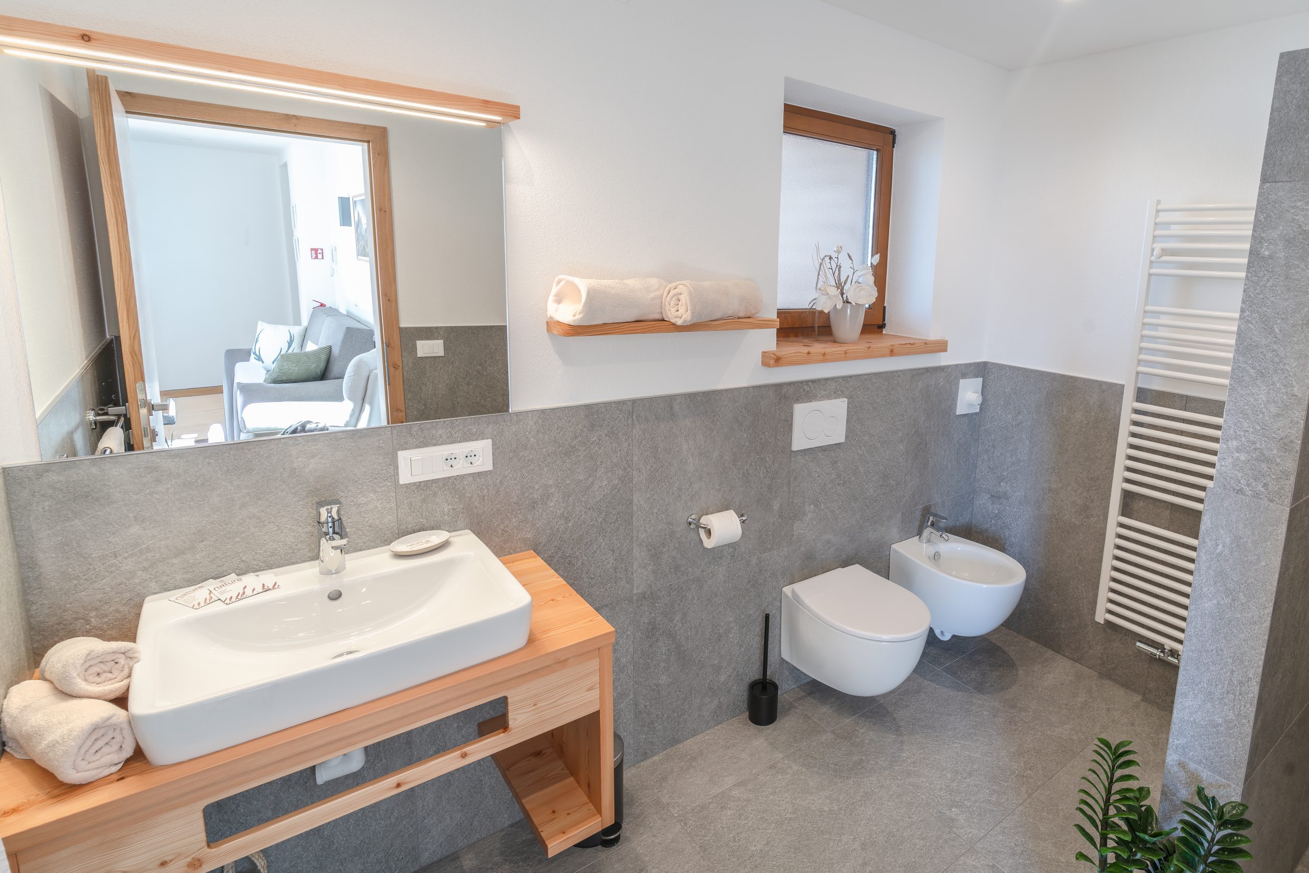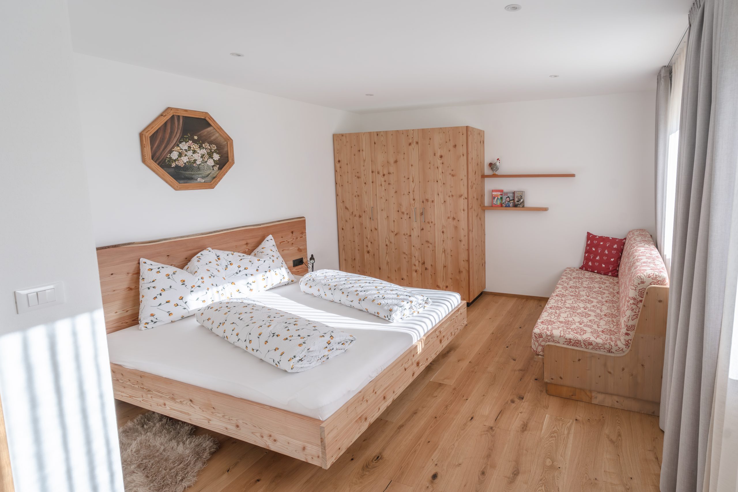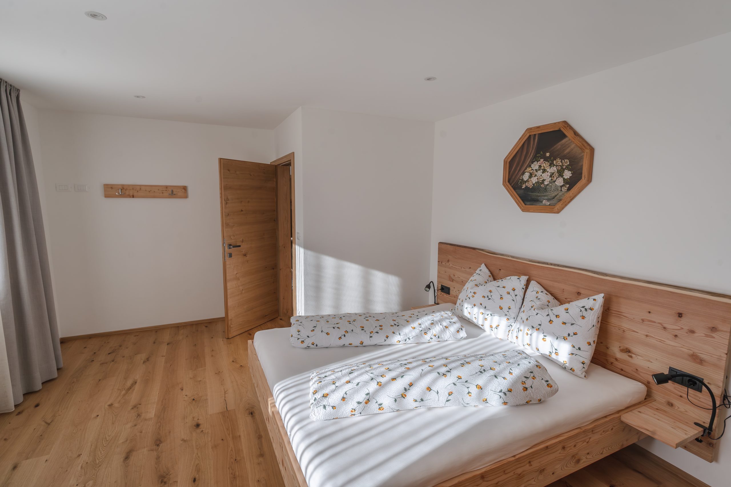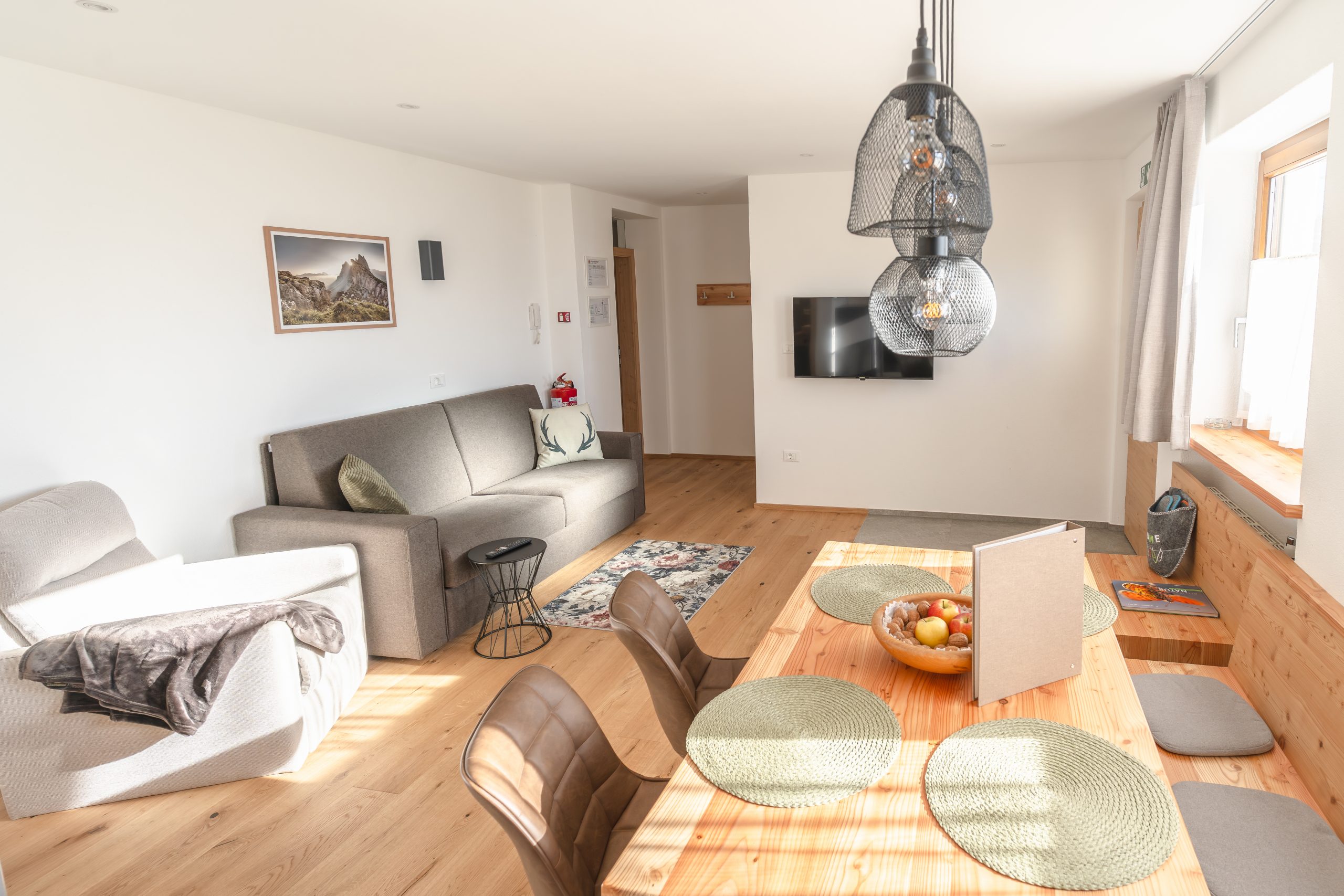 Unsere neu renovierte Wohnung im Erdgeschoss bietet den perfekten Rückzugsort. Sie ist nach Süden ausgerichtet und besitzt einen eigenen Außeneingang. Die Möbel aus heimischer Lärche verleihen der Wohnung eine natürliche und gemütliche Atmosphäre. Genießt den herrlichen Panoramablick auf die Dolomiten direkt von eurem Wohnbereich aus. Die Wohnung liegt neben der Liegewiese, wodurch ihr in den unmittelbaren Genuss der Sonne und der frischen Bergluft kommt. Ideal für alle, die eine ruhige, komfortable Unterkunft mit direktem Zugang zur Natur suchen.
