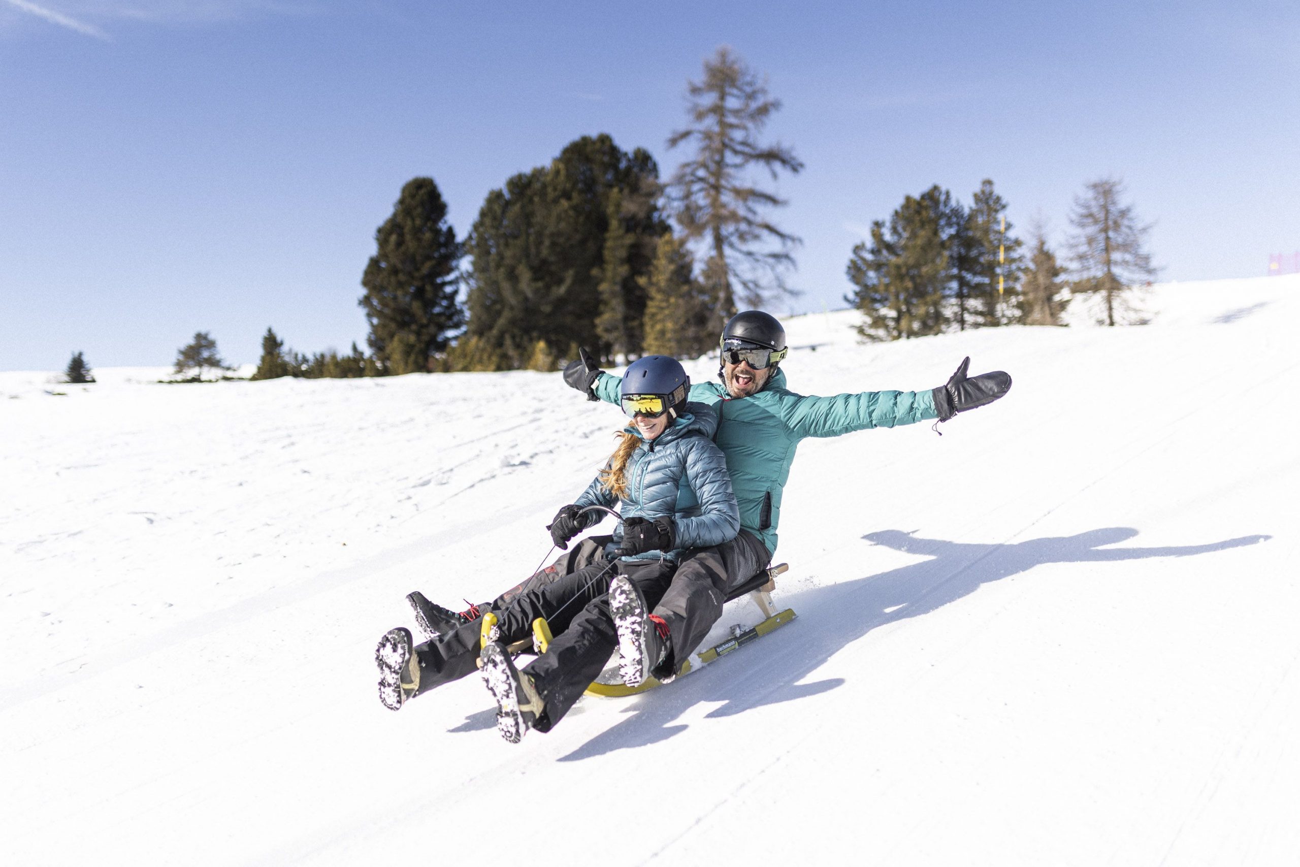 Auf der 2,5 km langen Naturrodelbahn am Rittner Horn saust ihr durch den Winterwald – ein Spaß für die ganze Familie!